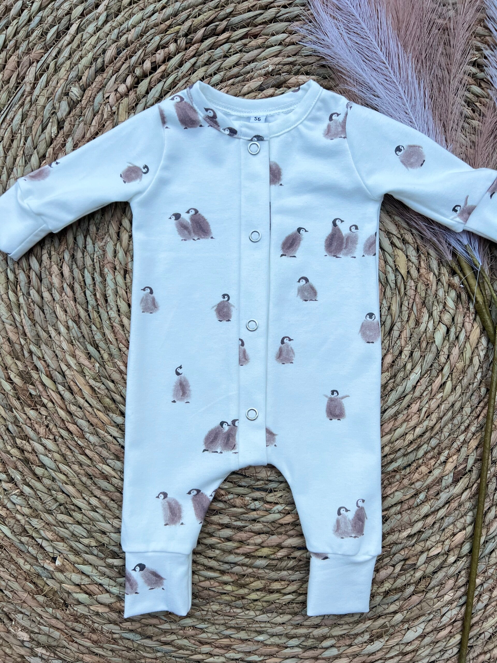 Doordat de boordjes van de jumpsuit om te slaan zijn (en je hem daardoor dus iets kleiner kan maken), raad ik een maat 50/56 aan bij de geboorte. Heeft u nu een écht kleine baby (vroeg geboren / prematuur), dan raad ik een maat NB/50 aan.